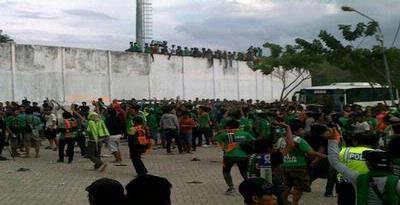 Bonek sempat bentrok dengan polisi saat memaksa masuk ke Stadion Letjen H Soedirman Bojonegoro, Sabtu (10/3/2012) petang ini.