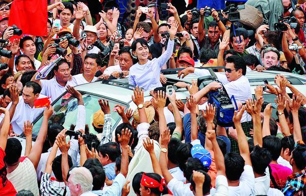 Pemimpin oposisi Myanmar, Aung San Suu Kyi, membalas sambutan pendukungnya saat meninggalkan markas Liga Nasional untuk Demokrasi (NLD) setelah menyampaikan pidatonya, di Yangon, Senin (2/4). Suu Kyi menyambut datangnya "era baru" Myanmar dan menyerukan persatuan setelah NLD mengklaim kemenangan besar di pemilu sela. Yangon (News Today) - Aung San Suu Kyi (66), tokoh prodemokrasi Myanmar, Senin (2/4/2012), mengklaim dia dan Liga Nasional untuk Demokrasi (NLD) meraih kemenangan bersejarah dalam pemilu hari Minggu. Peraih Hadiah Nobel Perdamaian ini melihat kemenangan itu sebagai sebuah ”era baru”. Ia menyerukan persatuan politik Myanmar.