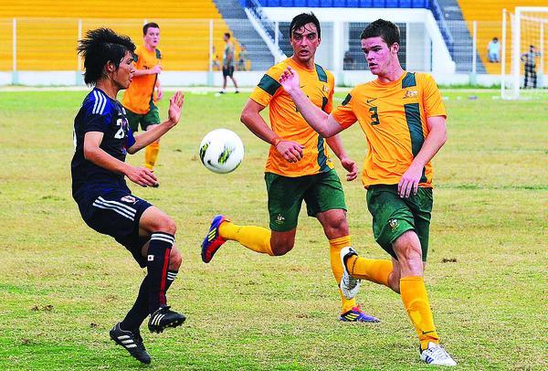 Pemain tim nasional Jepang U-22 Hirato (kiri) dihadang dua pemain Australia Connor Edward dan Daniel Petkovski dalam pertandingan Piala Konfederasi Sepak Bola Asia (AFC) U-22 Kualifikasi Grup E di Stadion Kaharuddin Nasution, Pekanbaru, Riau, Minggu (15/7). Jepang menang telak 5-0 atas Australia. Dengan hasil ini, Jepang meraih poin sempurna 15 dari lima kemenangan pada lima partai di Grup E Kualifikasi Piala AFC U-22. Jakarta, Indonesia (News Today) - Tim nasional Indonesia U-22 tampil mengesankan saat menundukkan Singapura, 2-0, di laga terakhir kualifikasi Grup E Piala Asia U-22, Minggu (15/7/2012). Indonesia bertengger di peringkat ketiga grup dengan nilai sembilan, tetapi tidak mungkin lolos ke putaran final melalui jalur peringkat tiga terbaik.