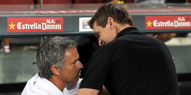 Pelatih Real Madrid, Jose Mourinho (kiri), dan pelatih Barcelona, Tito Vilanova, berjabat tangan sebelum anak-anak didik mereka melakoni duel leg pertama Piala Super Spanyol, di Camp Nou, Kamis (23/8/2012).Saat melawat ke wilayah Katalan, armada Jose Mourinho dipaksa takluk 2-3 dari "El Azulgrana". Praktis, tak ada kata selain menang yang diusung "Si Putih" kali ini.